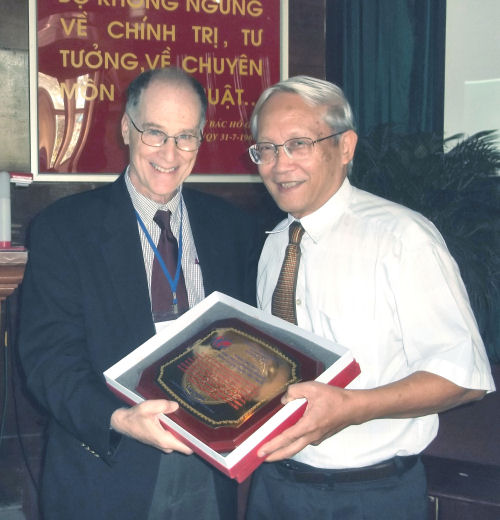 ![]() Dr Dang Hanh De was presented with a plaque of appreciation from the ICHF for his pioneering work in the development of CT Surgery at Viet Duc Hospital in Hanoi, Vietnam, November 2012 |